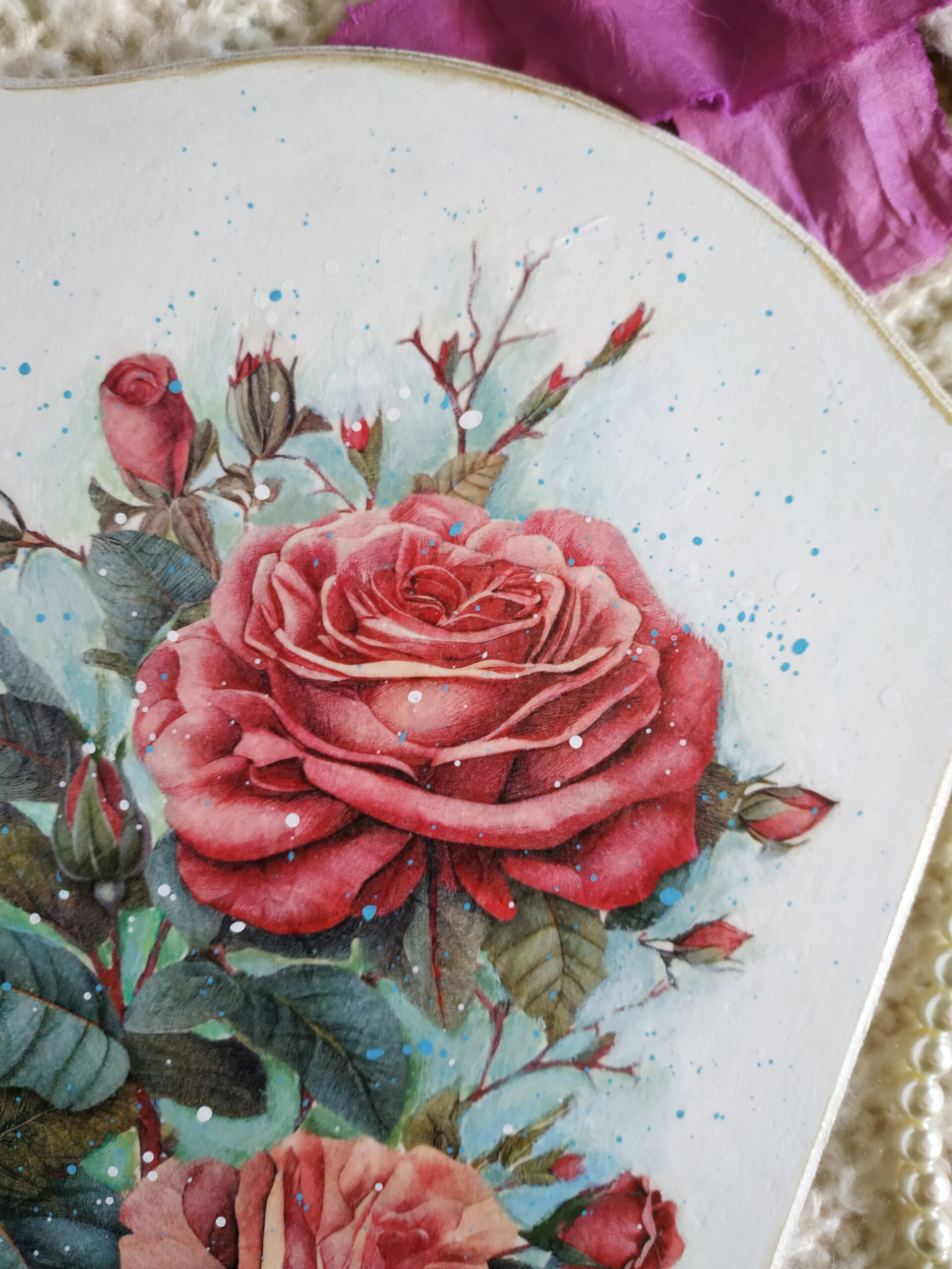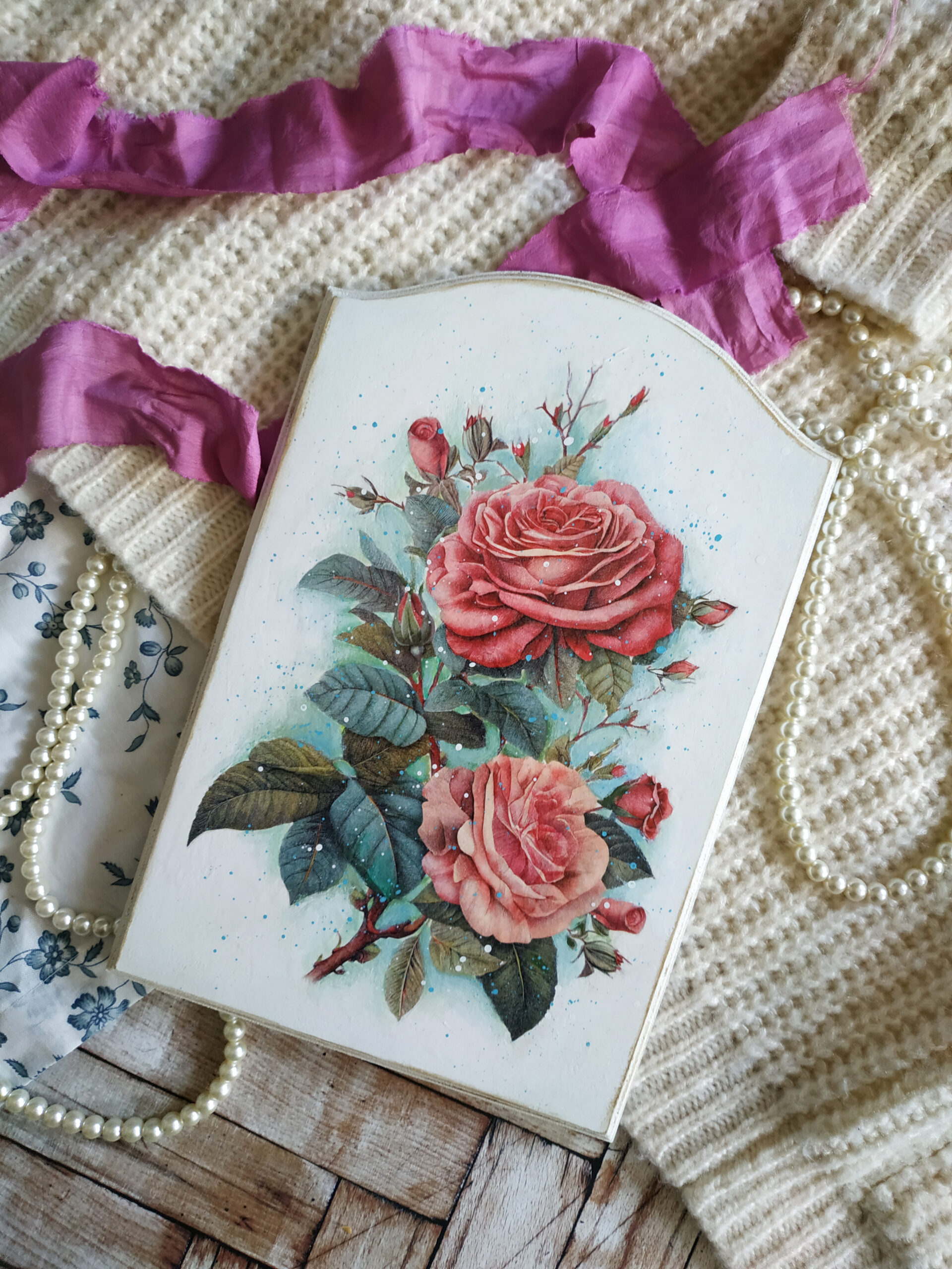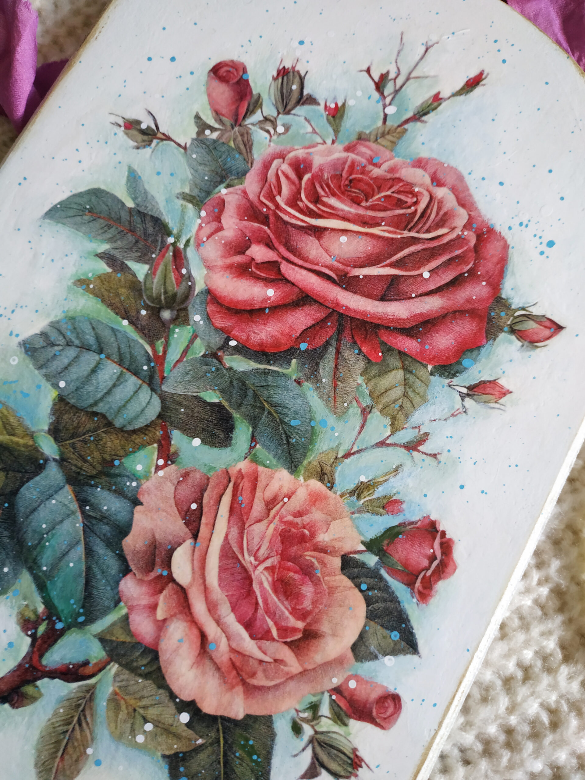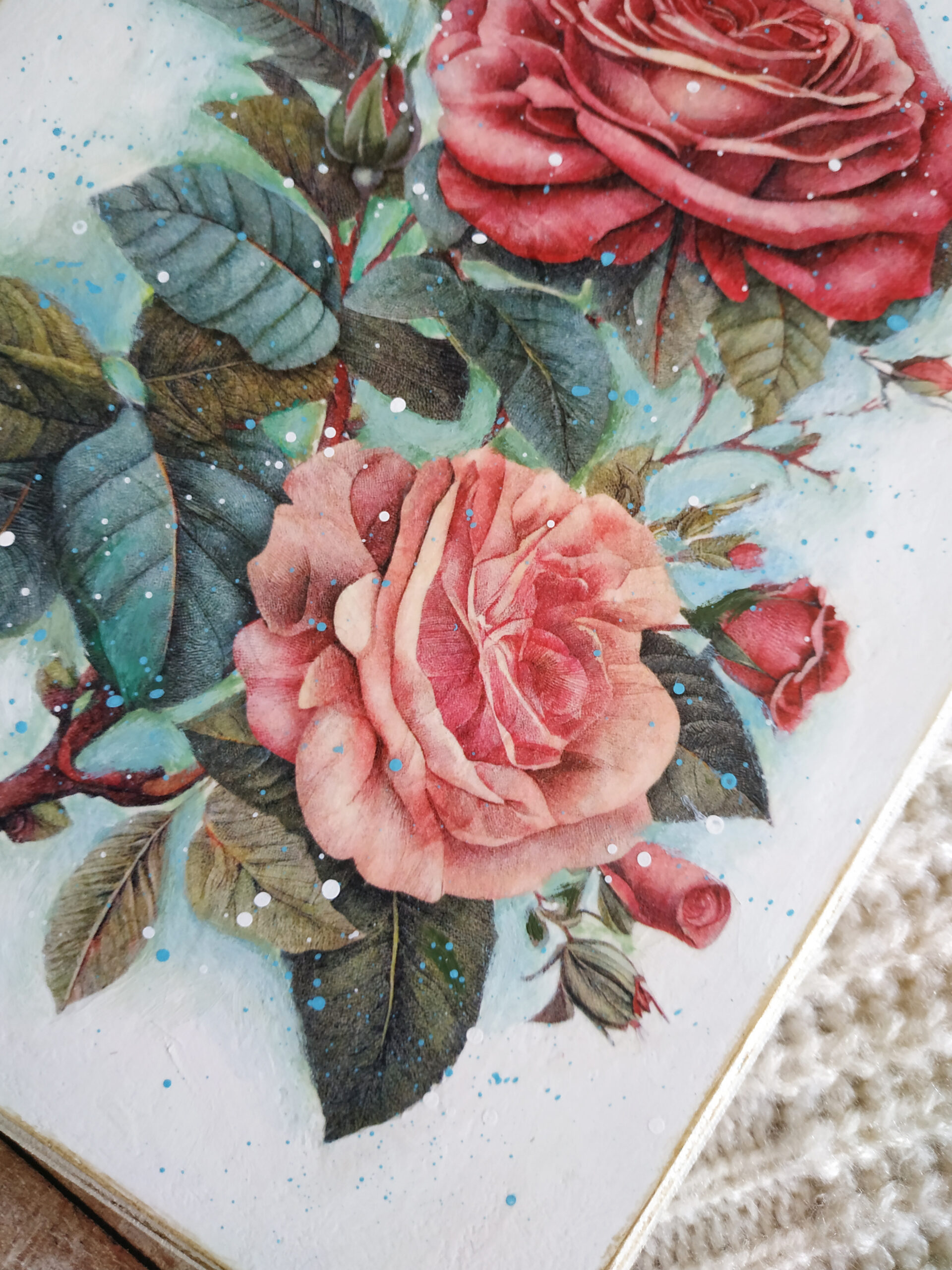 Panel z motywem pięknych róż w kolorze czerwonym i koralowym  o wymiarach ok. 20x30cm, ręcznie zdobiony przy pomocy techniki decoupage, z użyciem farb akrylowych w odcieniach błękitu i zieleni oraz wosku w kolorze antycznego złota.