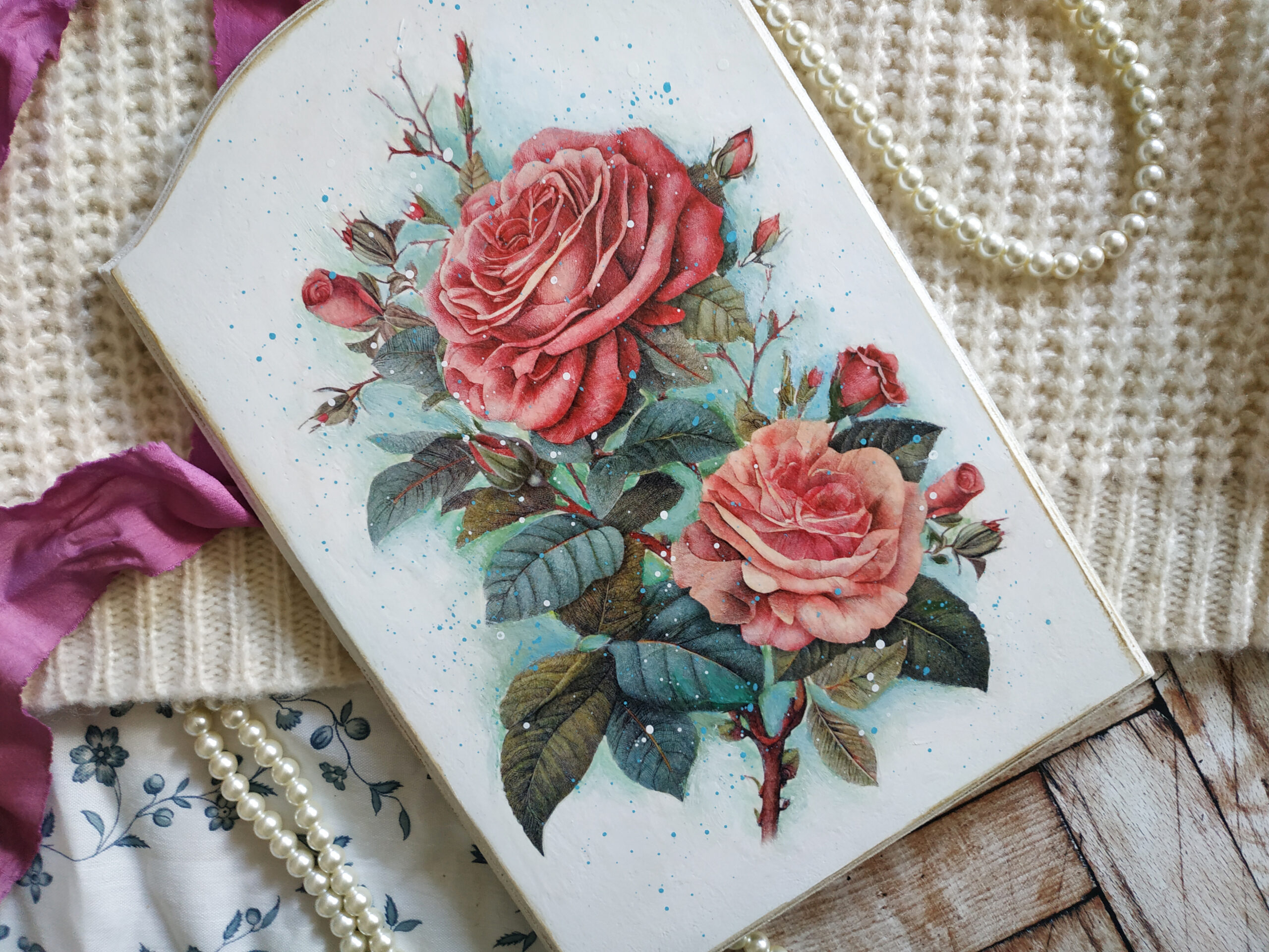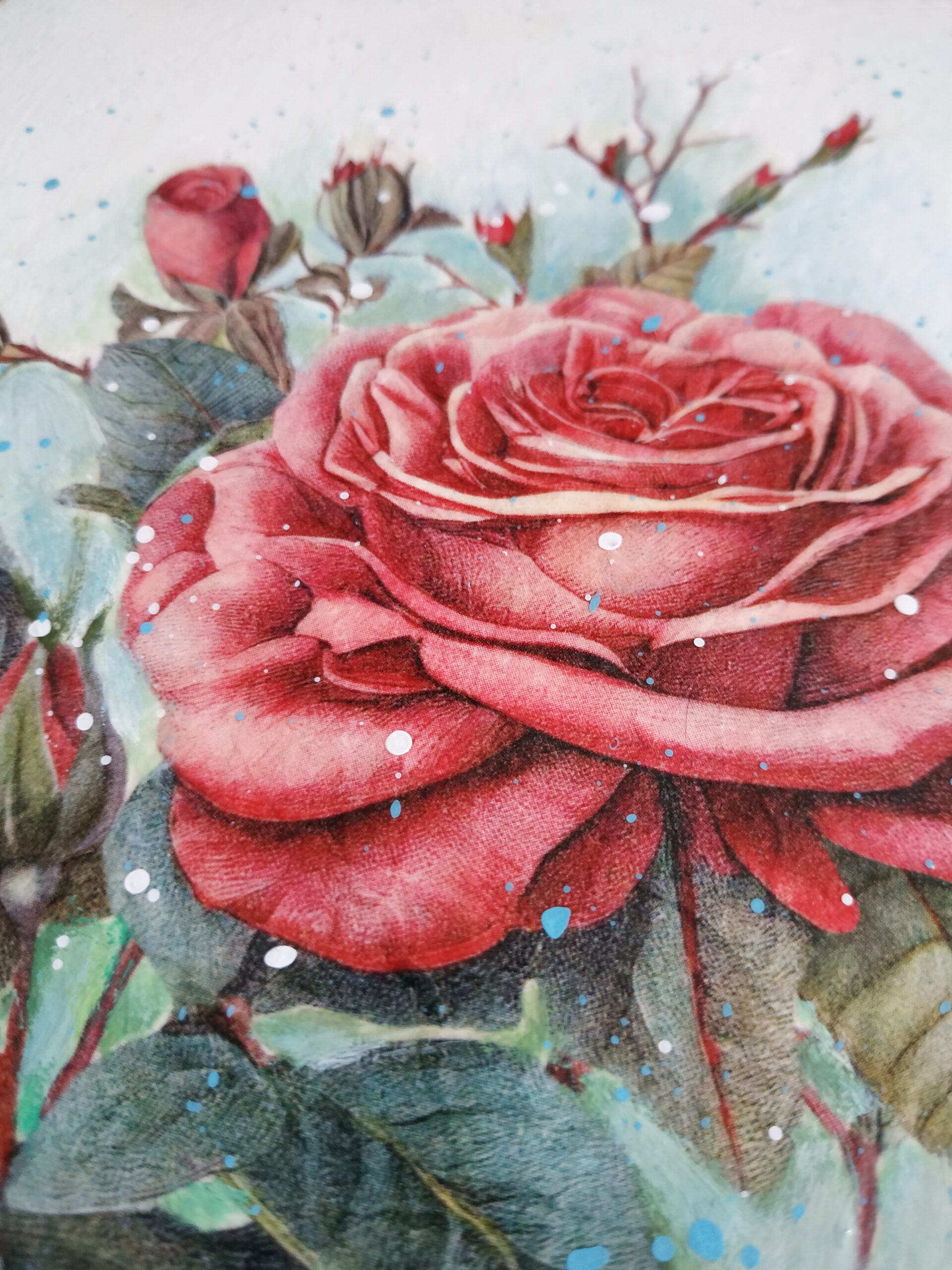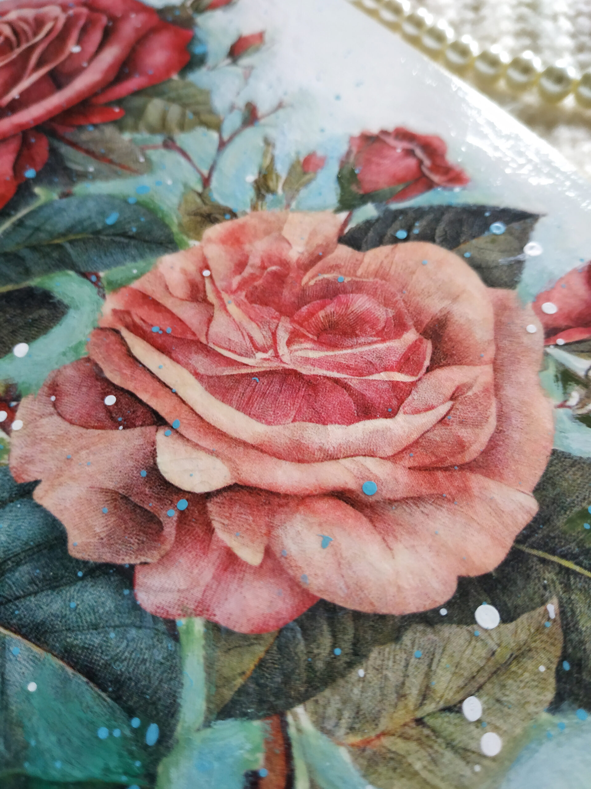 W pełni cieszę się tą nową porą roku. Lubię wychodzić na poranne spacery, chłonąć ciszę i wdychać chłodne, rześkie powietrze. Po powrocie szykuję sobie duży kubek herbaty z dodatkiem cytryny i odrobiną miodu lipowego lub rzepakowego. Dużo czasu spędzam też w swojej pracowni tworząc dekoracje do mieszkania, malując lub wykonując kartki i rzeczy z papieru do scrapbookingu. Kilka dni temu przygotowałam panel dekoracyjny o wymiarach 20x30cm z motywem pięknych róż w kolorze czerwonym i koralowym. Kwiaty podmalowałam farbami akrylowymi w odcieniach błękitu oraz zieleni. Całość pokryłam kilkoma warstwami szklącego lakieru transparentnego oraz zrobiłam chlapania z użyciem niebieskiej i białej farby akrylowej.