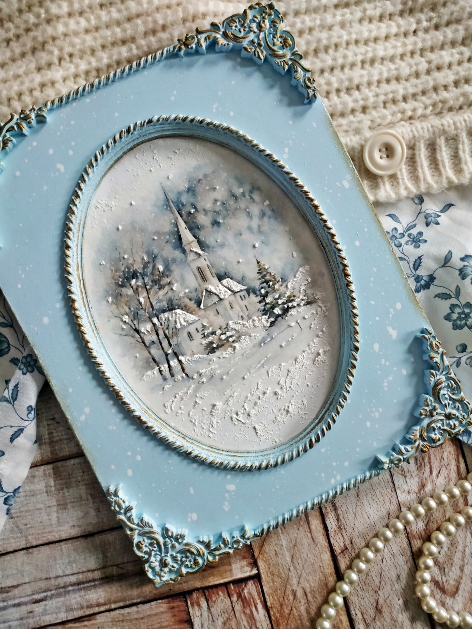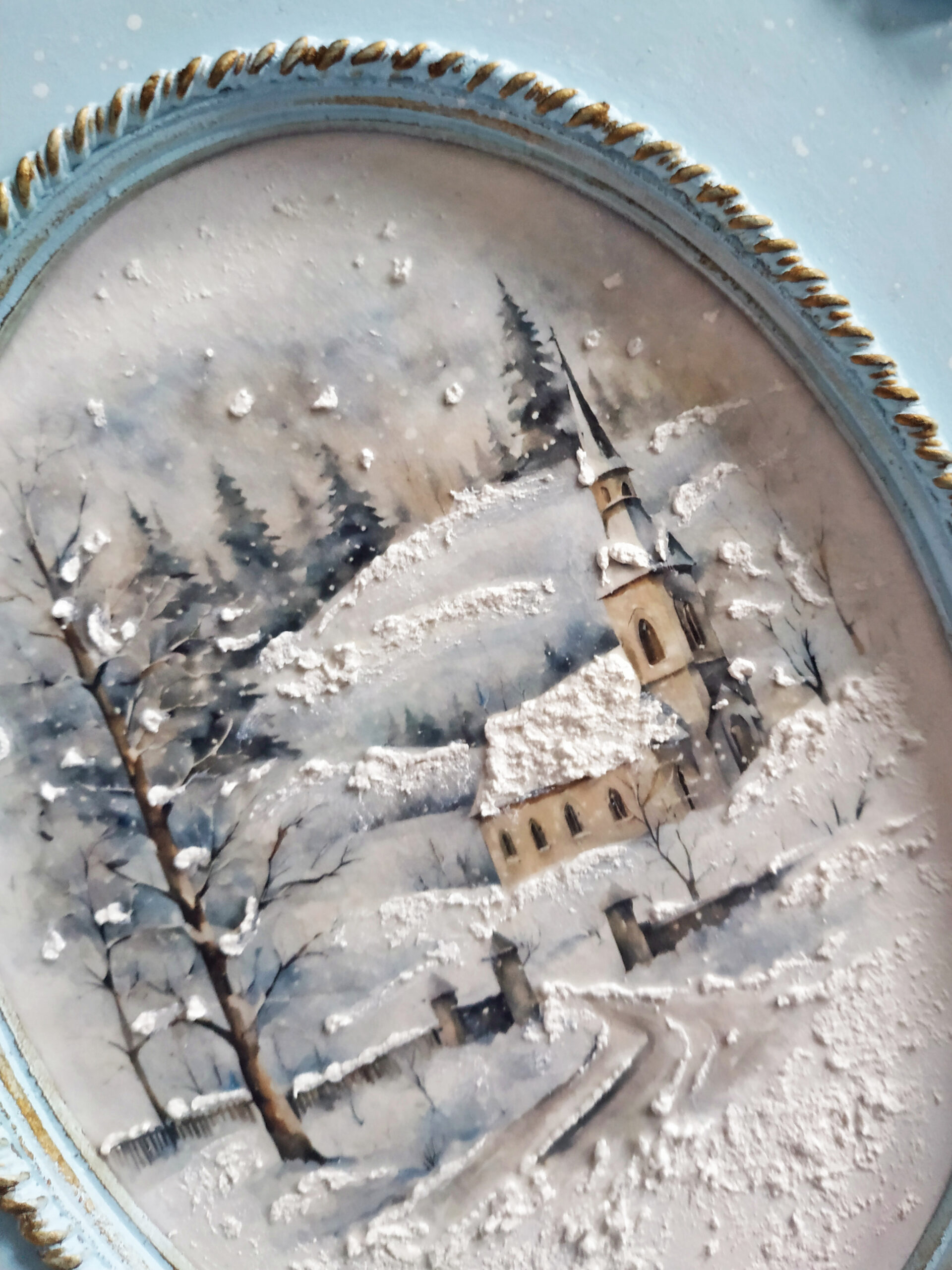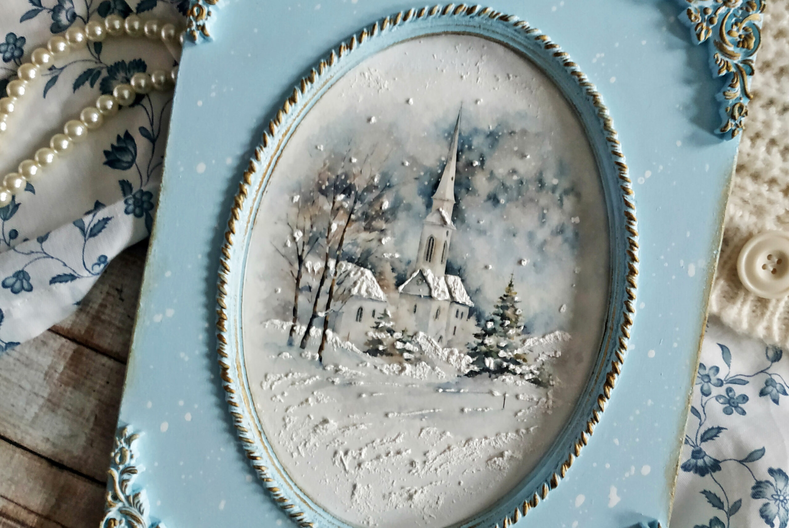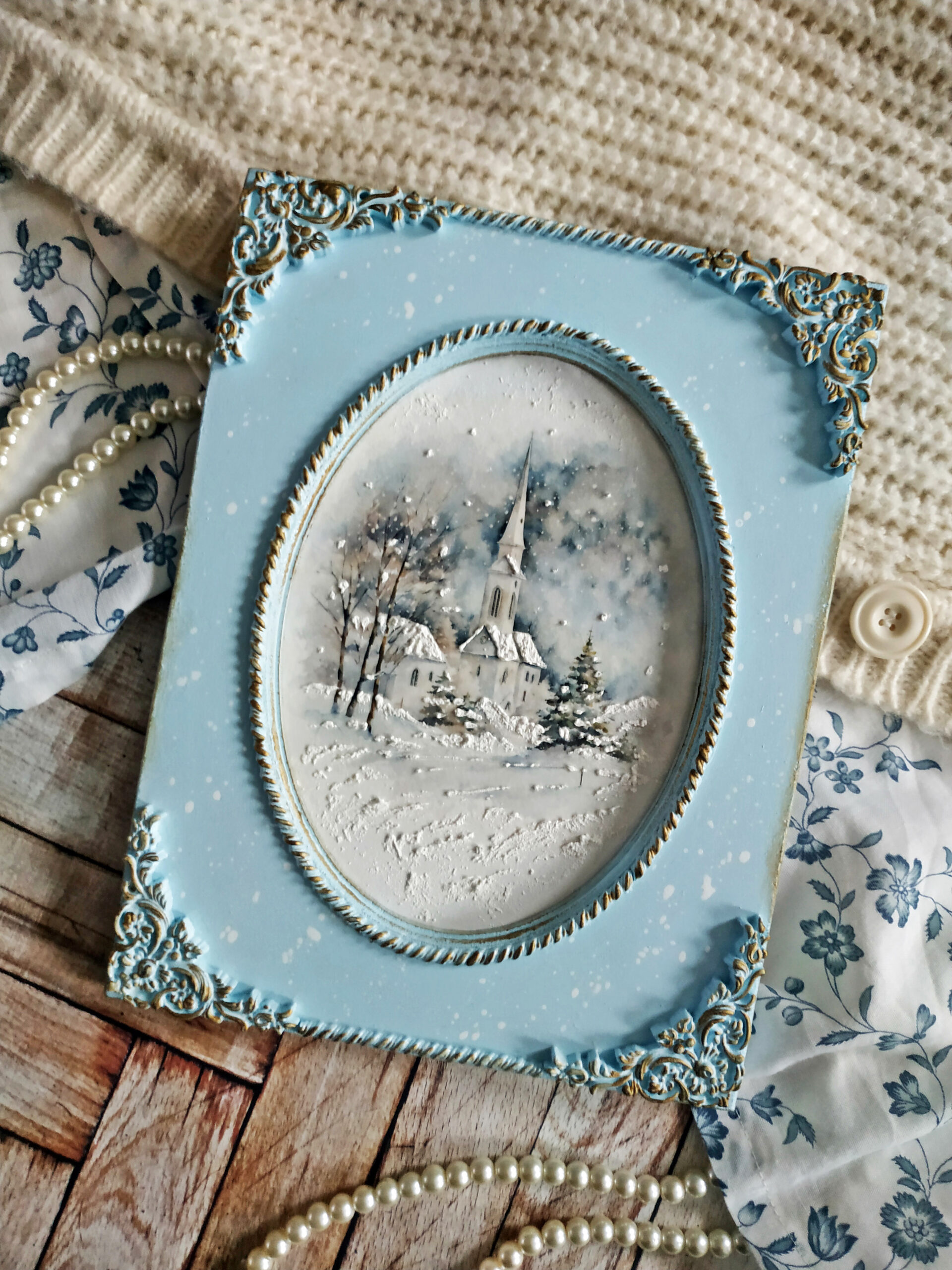 Moje myśli wędrują do czasu tak bliskiego mojemu sercu, Świąt Bożego Narodzenia. Wczoraj wieczorem z moją kotką Marcysią, zwiniętą w kłębek obok mnie, tworzyłam kolejne zimowe obrazki z motywem delikatnych kościołów. Tym razem użyłam dwuczęściową bazę ze sprasowanych włókien drzewnych z wciętym owalem pięknie frezowanym. Kolejny raz sięgnęłam po papier ryżowy przeznaczony do decoupage z cudnymi zimowymi grafikami o akwarelowym wykończeniu, które dodatkowo potraktowałam cienką warstwą pasty śniegowej. Z lekkiej glinki wykonałam delikatne ornamenty, którymi ozdobiłam swoją prace. Wyciski oraz ramkę pomalowałam farbą akrylową w kolorze rozbielonego błękitu i przetarłam ciemnym woskiem w kolorze antycznego złota. Całość zabezpieczyłam kilkoma warstwami bezbarwnego lakieru. Podczas pracy co chwilę spoglądałam z uśmiechem na drugą kotkę, Rosę, jak śpi na kanapie i słodko pochrapuje.