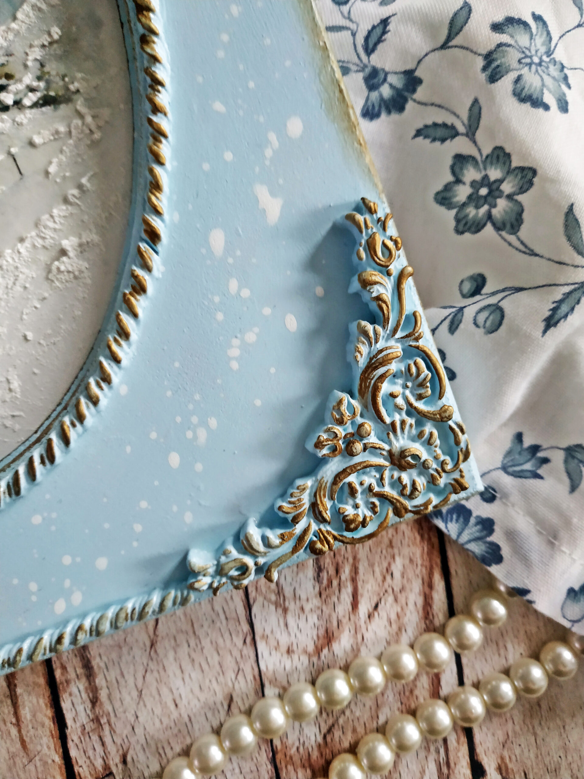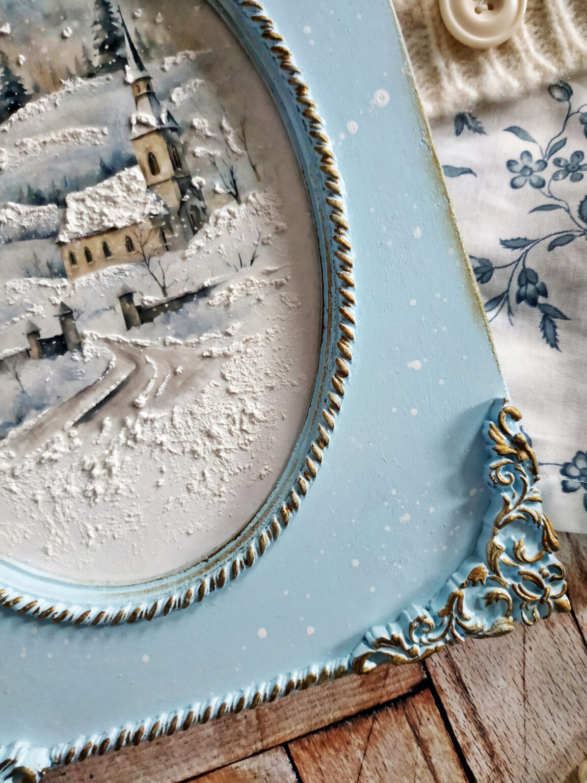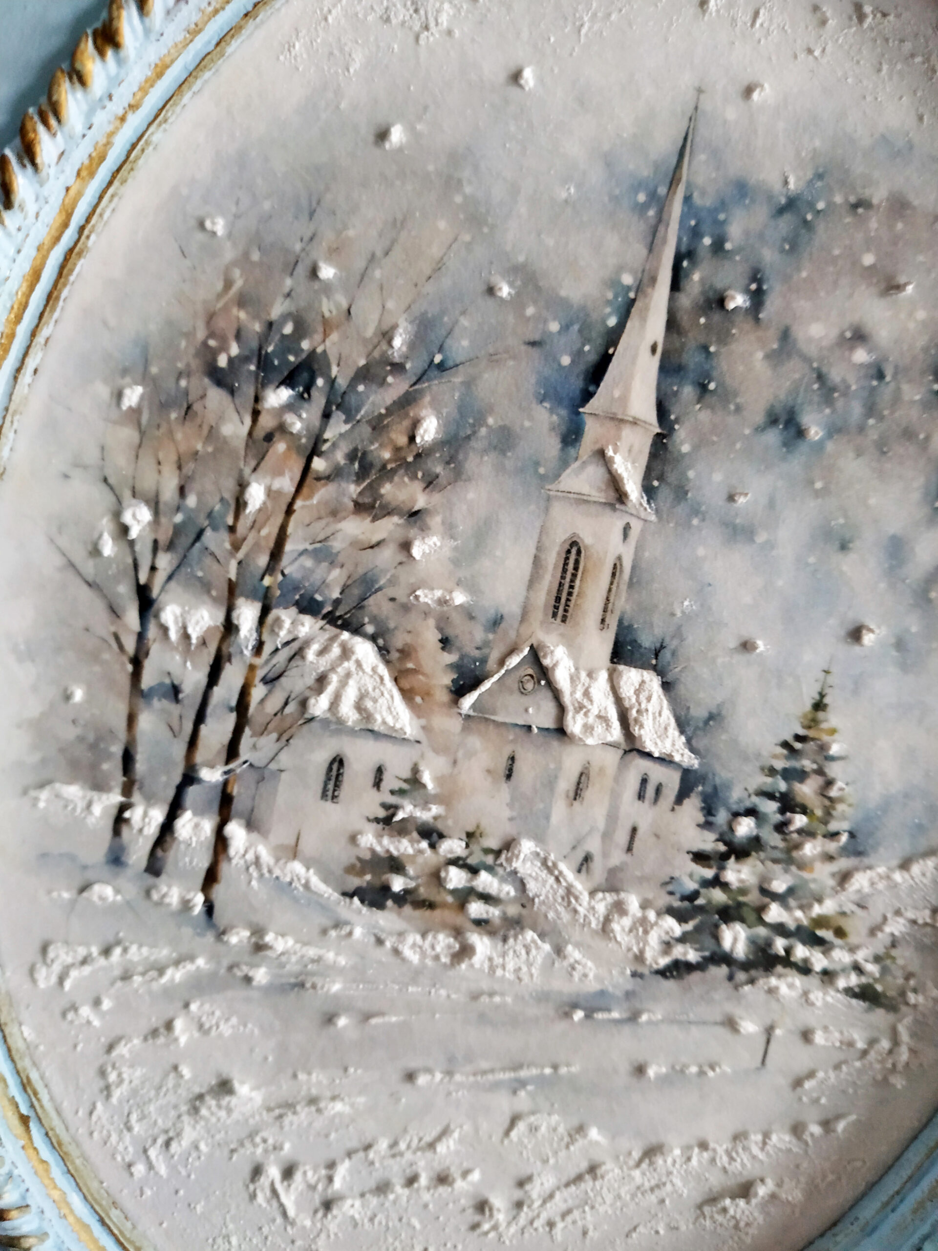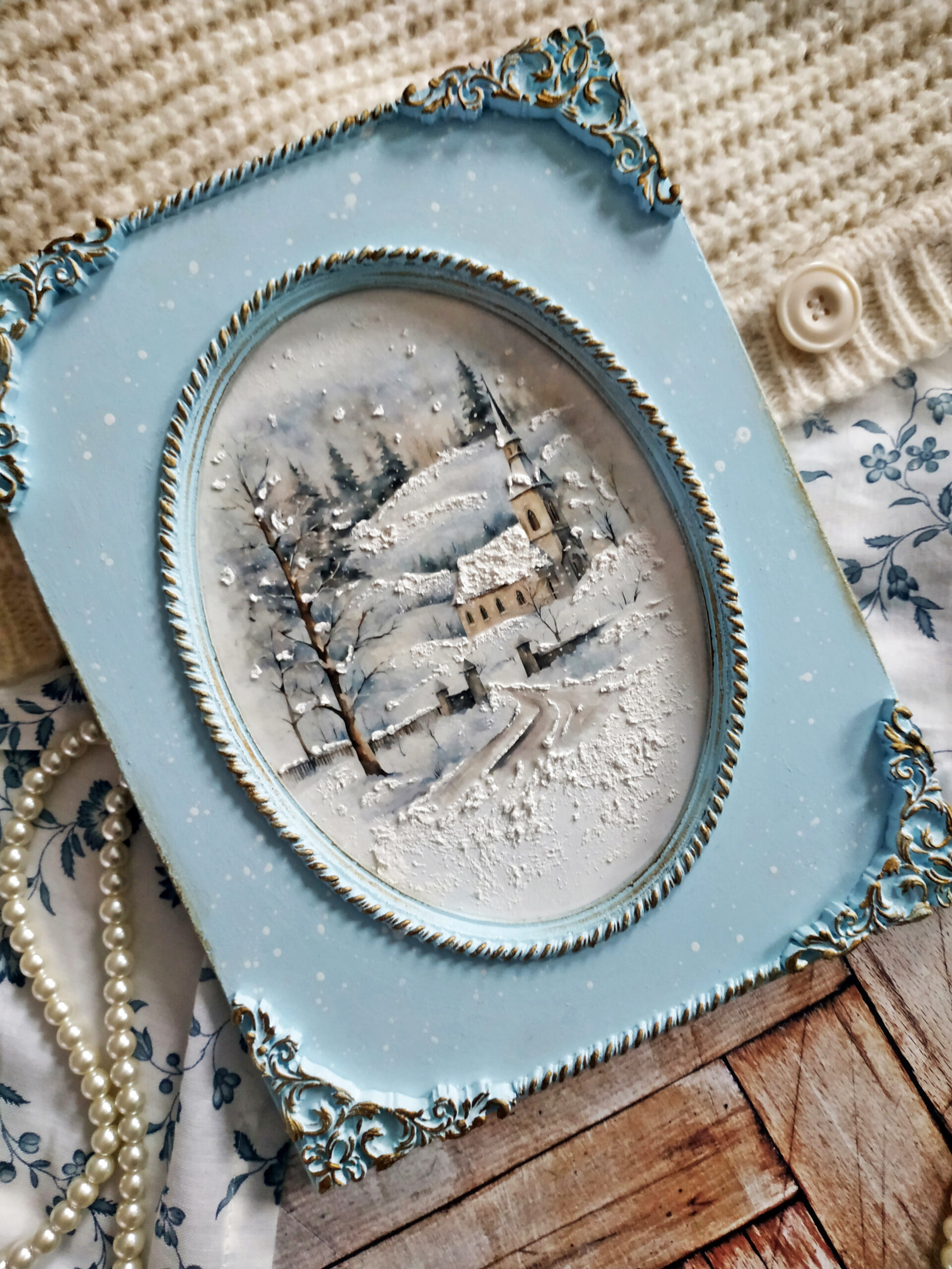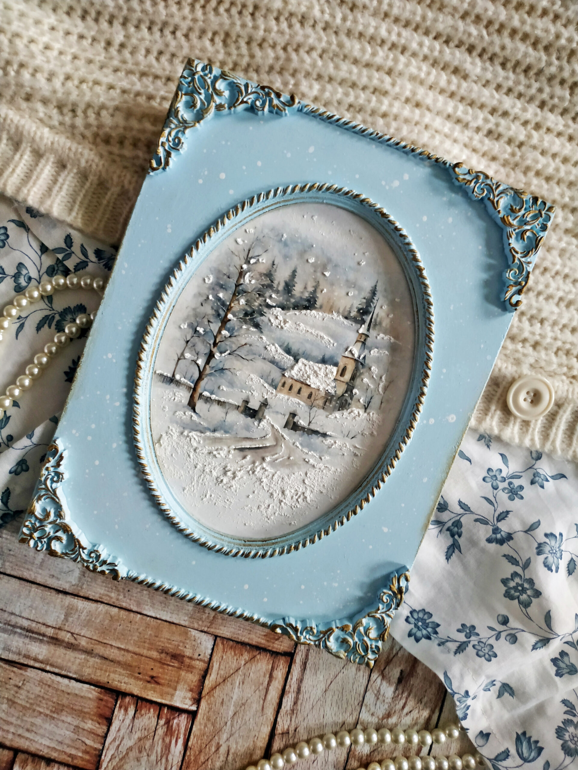 Moje myśli wędrują do czasu tak bliskiego mojemu sercu, Świąt Bożego Narodzenia. Wczoraj wieczorem z moją kotką Marcysią, zwiniętą w kłębek obok mnie, tworzyłam kolejne zimowe obrazki z motywem delikatnych kościołów. Tym razem użyłam dwuczęściową bazę ze sprasowanych włókien drzewnych z wciętym owalem pięknie frezowanym. Kolejny raz sięgnęłam po papier ryżowy przeznaczony do decoupage z cudnymi zimowymi grafikami o akwarelowym wykończeniu, które dodatkowo potraktowałam cienką warstwą pasty śniegowej. Z lekkiej glinki wykonałam delikatne ornamenty, którymi ozdobiłam swoją prace. Wyciski oraz ramkę pomalowałam farbą akrylową w kolorze rozbielonego błękitu i przetarłam ciemnym woskiem w kolorze antycznego złota. Całość zabezpieczyłam kilkoma warstwami bezbarwnego lakieru. Podczas pracy co chwilę spoglądałam z uśmiechem na drugą kotkę, Rosę, jak śpi na kanapie i słodko pochrapuje.