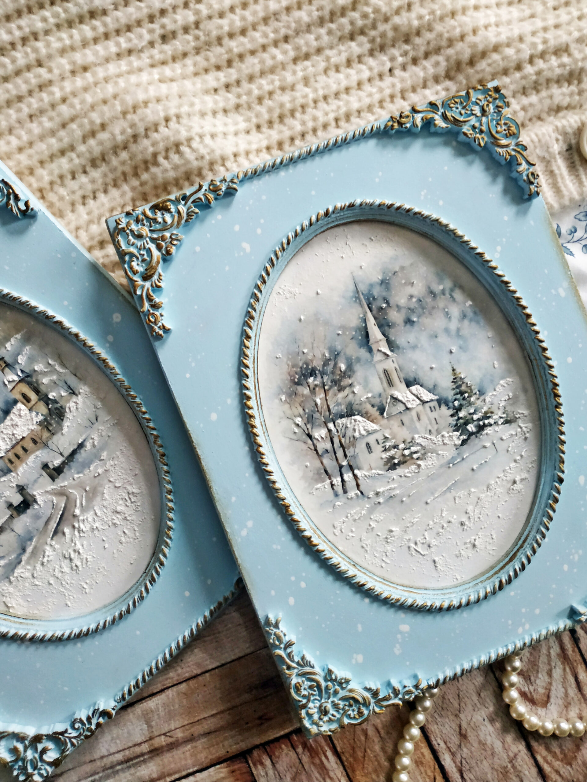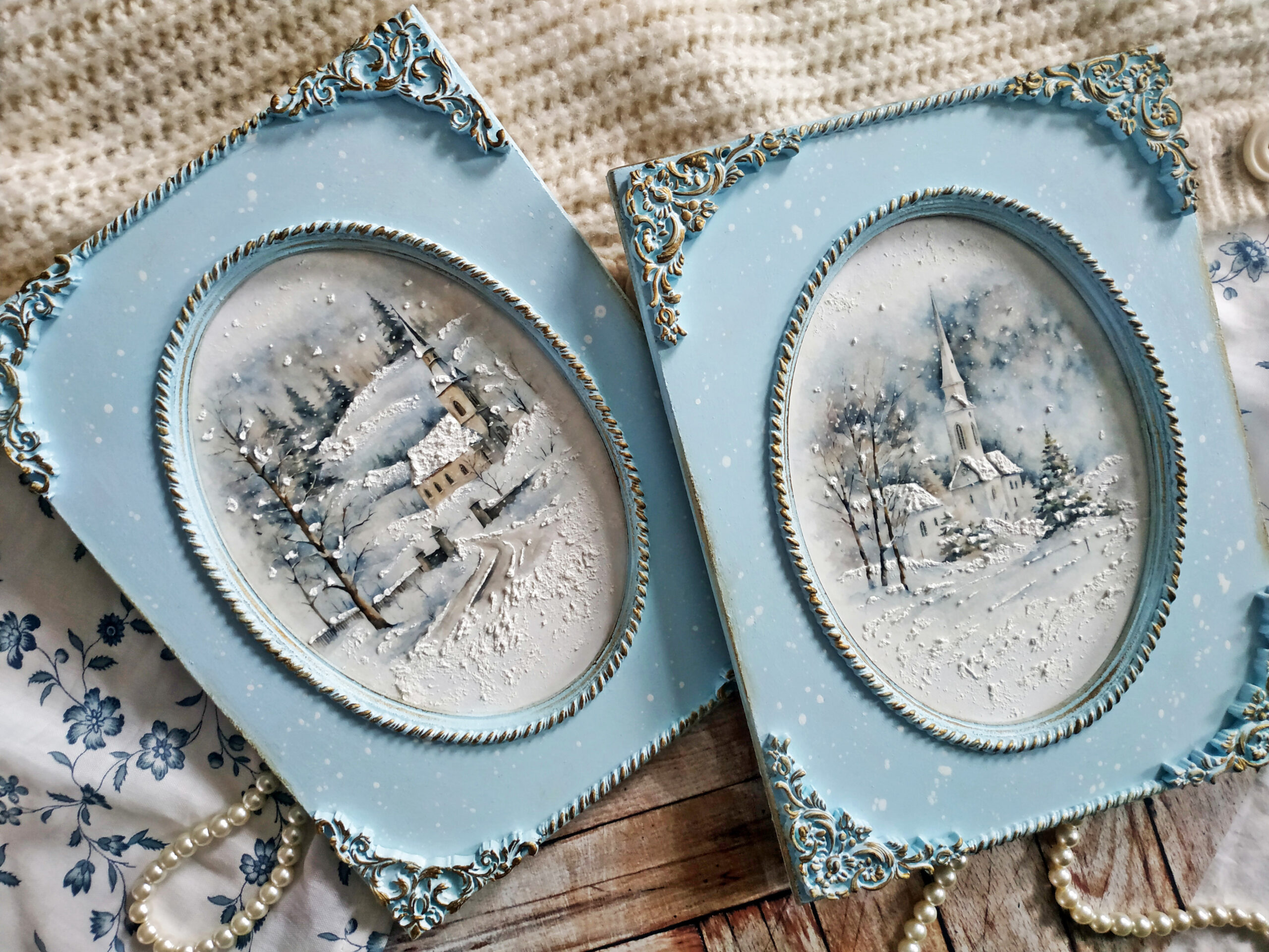 Obrazki z motywem zimowych krajobrazów z kościołami wykonane na frezowanych bazach o wymiarach 20x26cm, ręcznie zdobione przy pomocy techniki decoupage z użyciem papieru ryżowego, farb akrylowych, wosków postarzających w kolorze antycznego złota oraz lekkiej glinki.