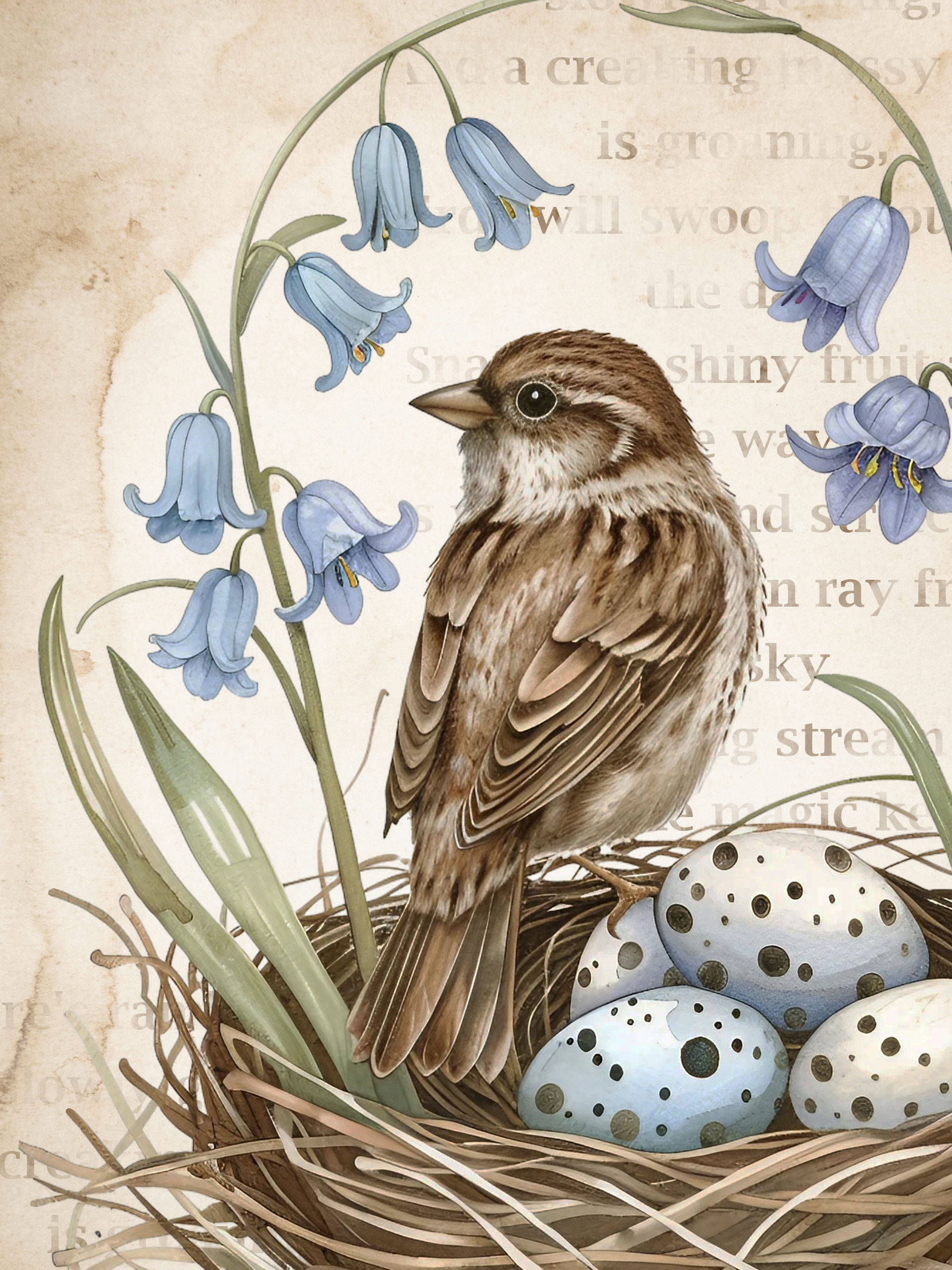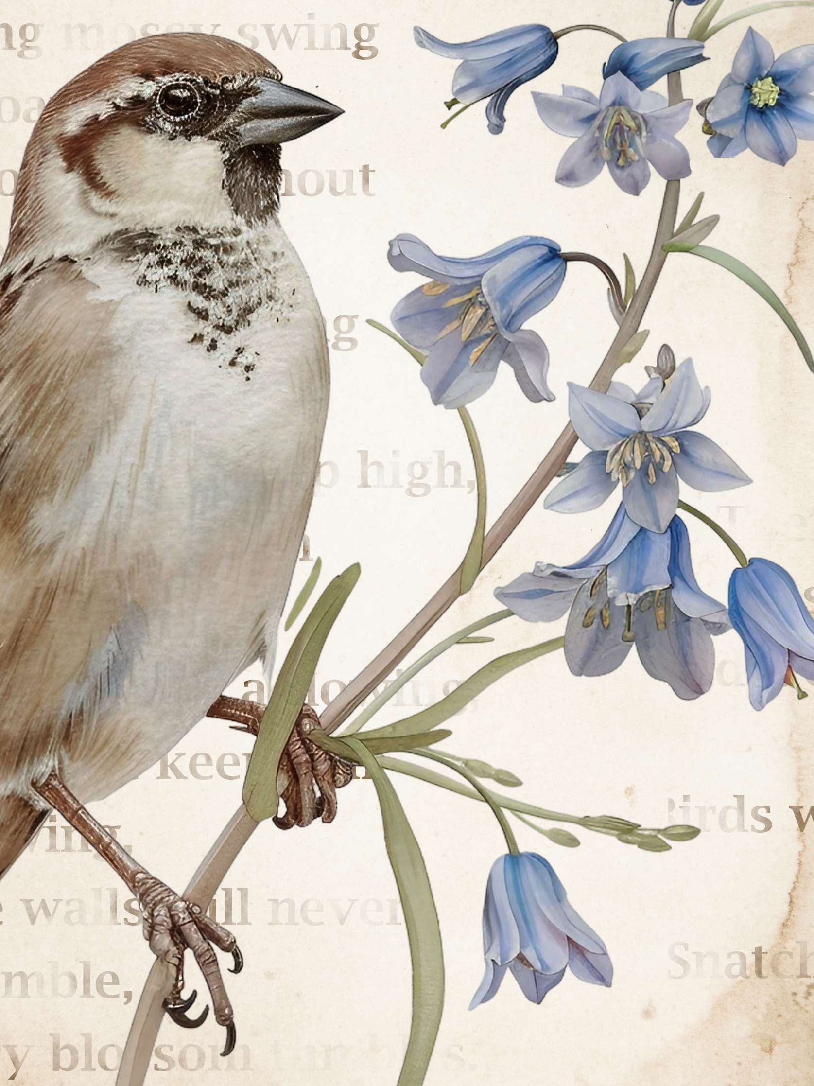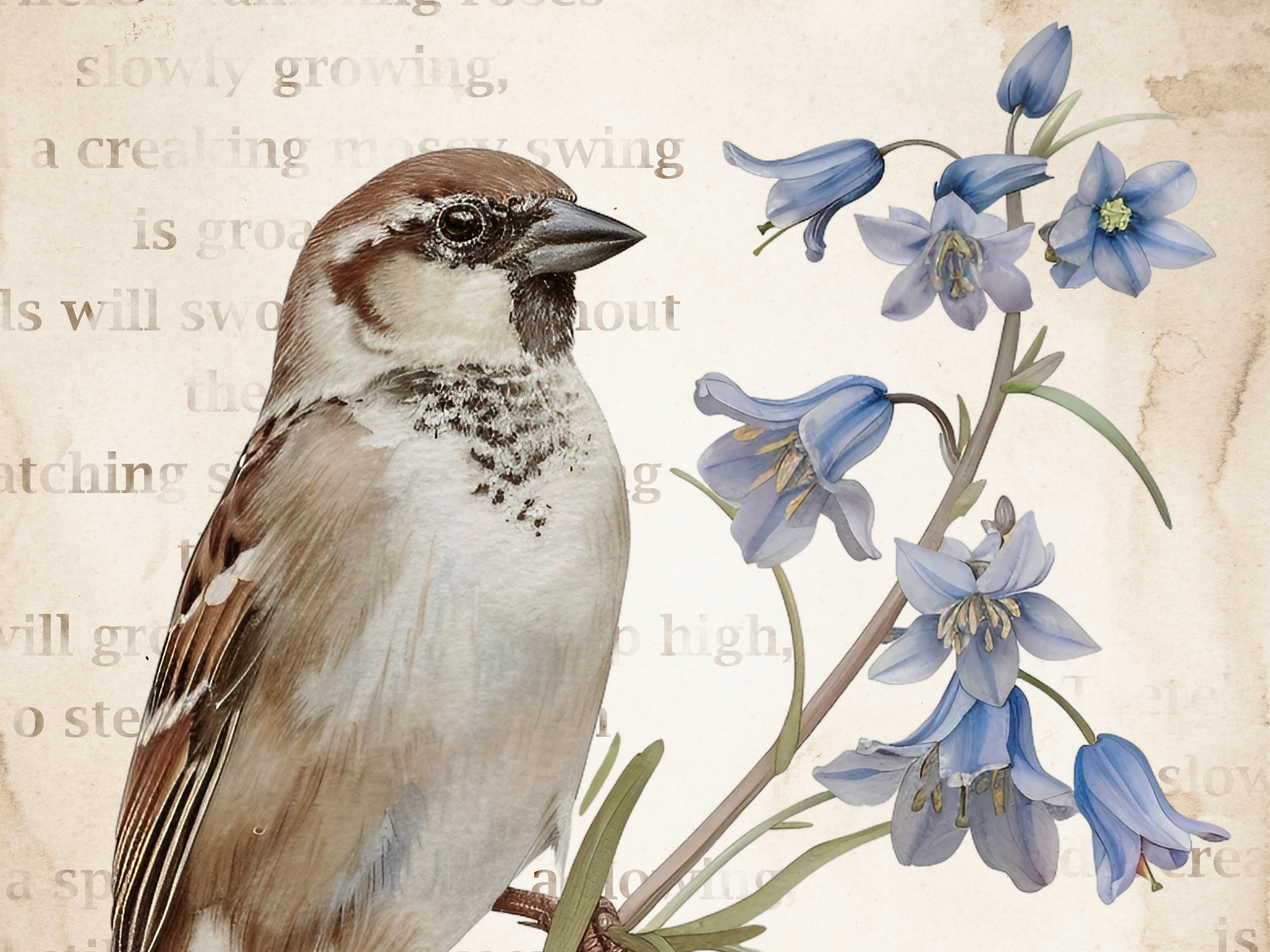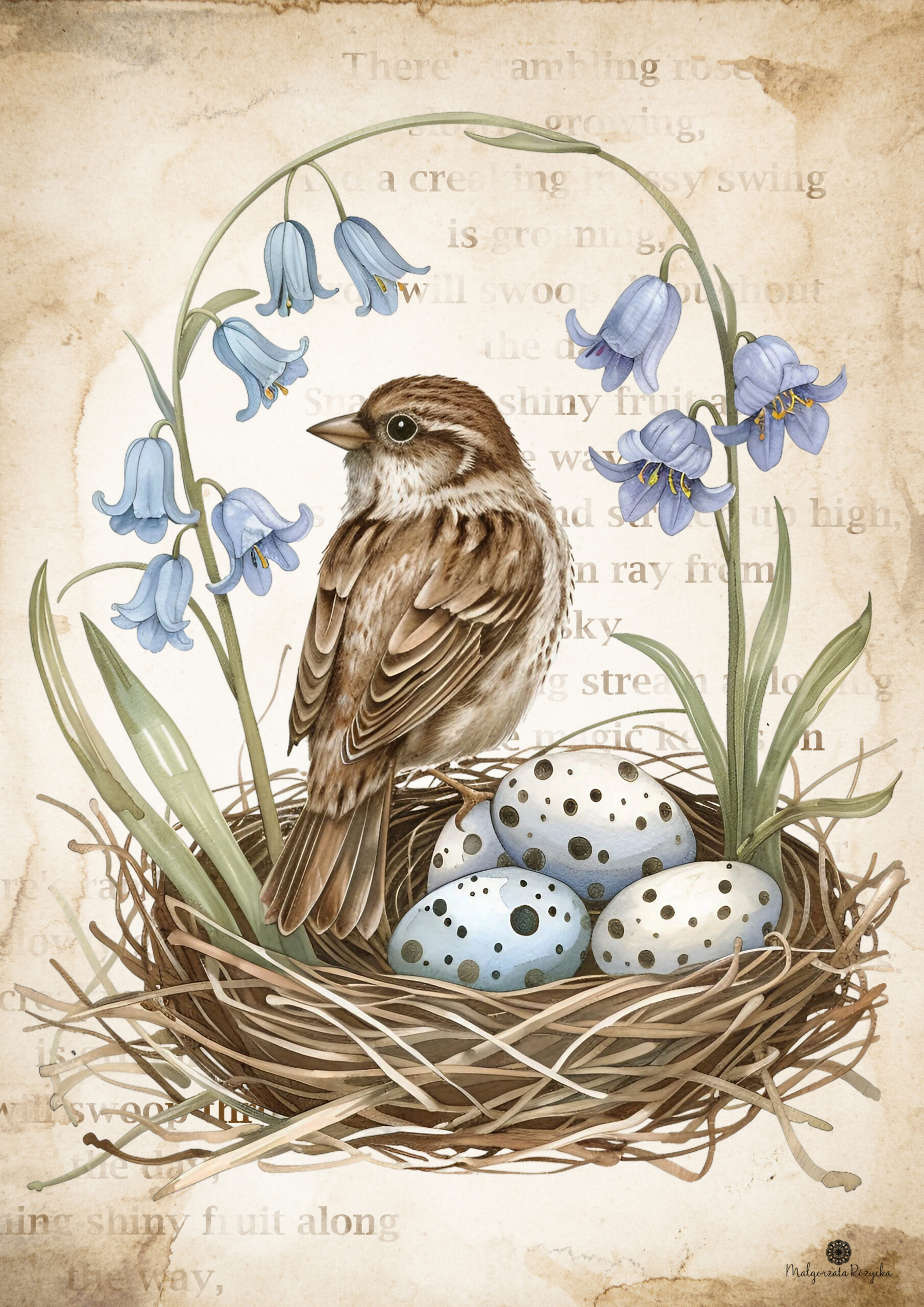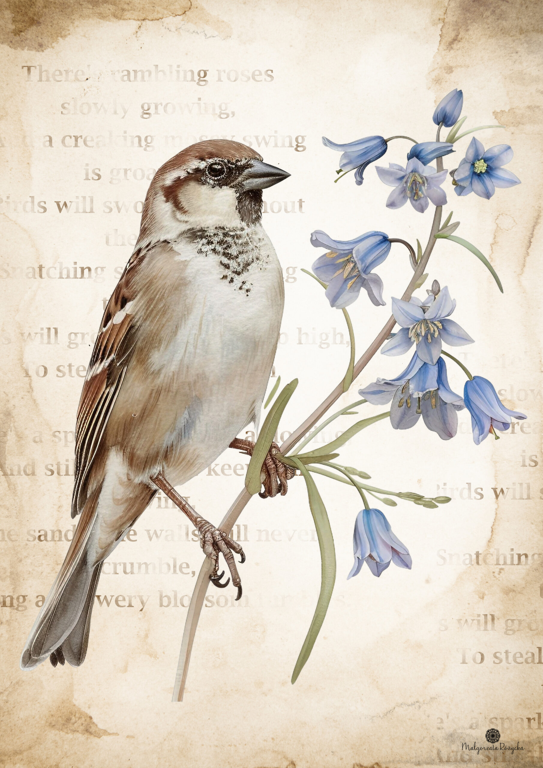Kiedy się obudziłam, niebo było czyste, a gwiazdy migotały wokół złotego księżyca. Otworzyłam delikatnie okno w sypialni i po cichu słuchałam dźwięków budzącej się natury. Jeszcze było wcześnie, ale gdzieś niedaleko śpiewały już pierwsze ptaki. Ich dźwięk odbił się echem pomiędzy kamienicami. Wziąłam głęboki oddech i zamknęłam oczy. W powietrzu unosił się zapach poranka i wilgotnej ziemi. Chłodny wiatr musnął moje włosy i oplótł ramiona, sprawiając, że zadrżałam jak młode drzewo podczas silnej burzy. Szybko zamknęłam okno, wciągnęłam na siebie obszerny sweter w szarym kolorze i udałam się do salonu. Koty spały na kanapie zwinięte w słodkie rogaliki. W całkowitej ciszy, jedynie z łagodną melodią pochrapywania kotek przystąpiłam do pracy. Zaprojektowałam dwa wiosenne plakaty w stylu vintage z motywem wróbli domowych w otoczeniu niebieskich dzwonków. W tle umieściłam stary, pożółkły i poplamiony kawą papier. Oprócz tego w programie graficznym zrobiłam delikatne napisy w kolorze ciepłego brązu, nadając grafikom staromodnego charakteru. Plakaty udostępniam swoim czytelnikom za darmo, mam nadzieję, że się podobają.