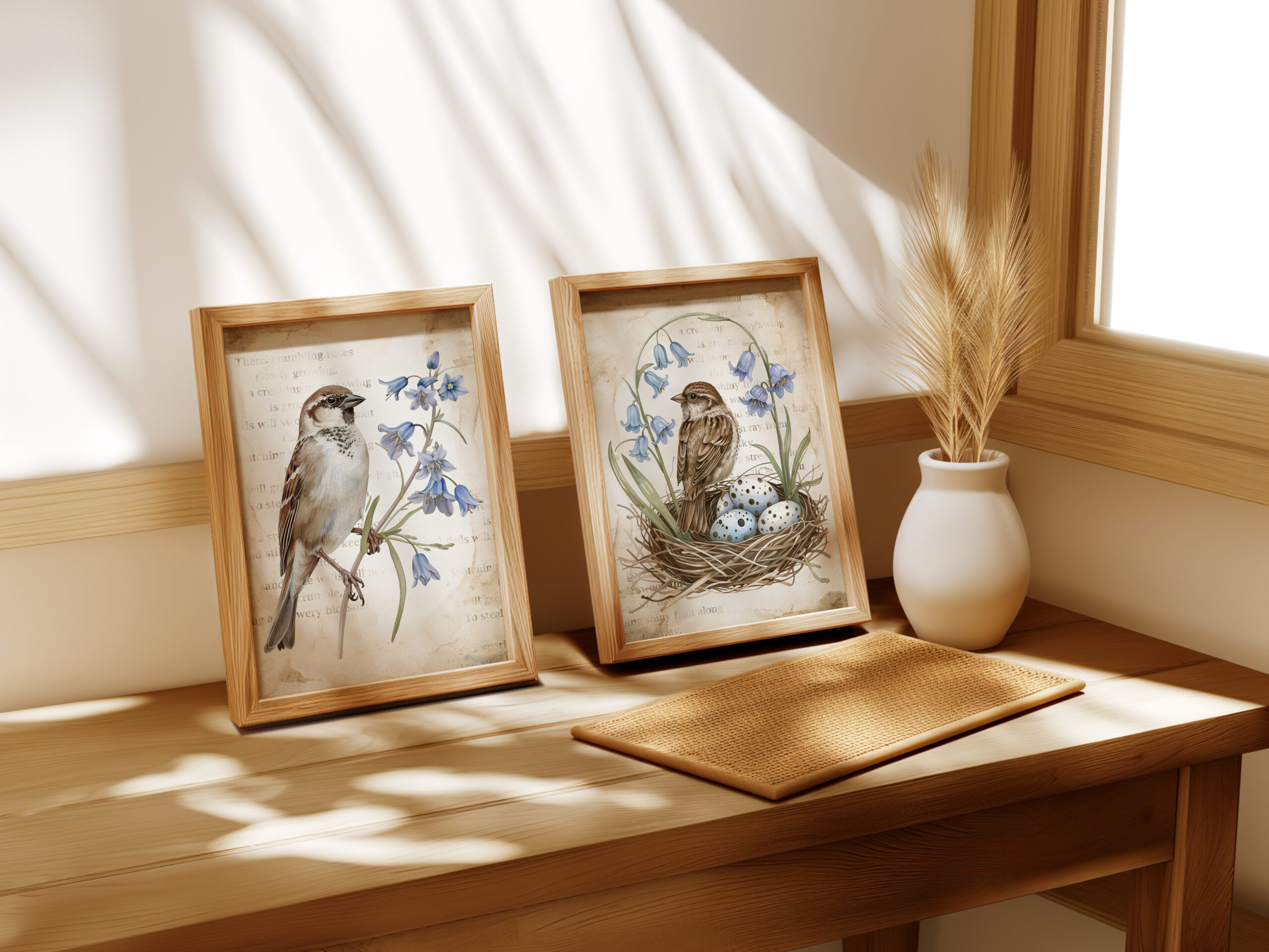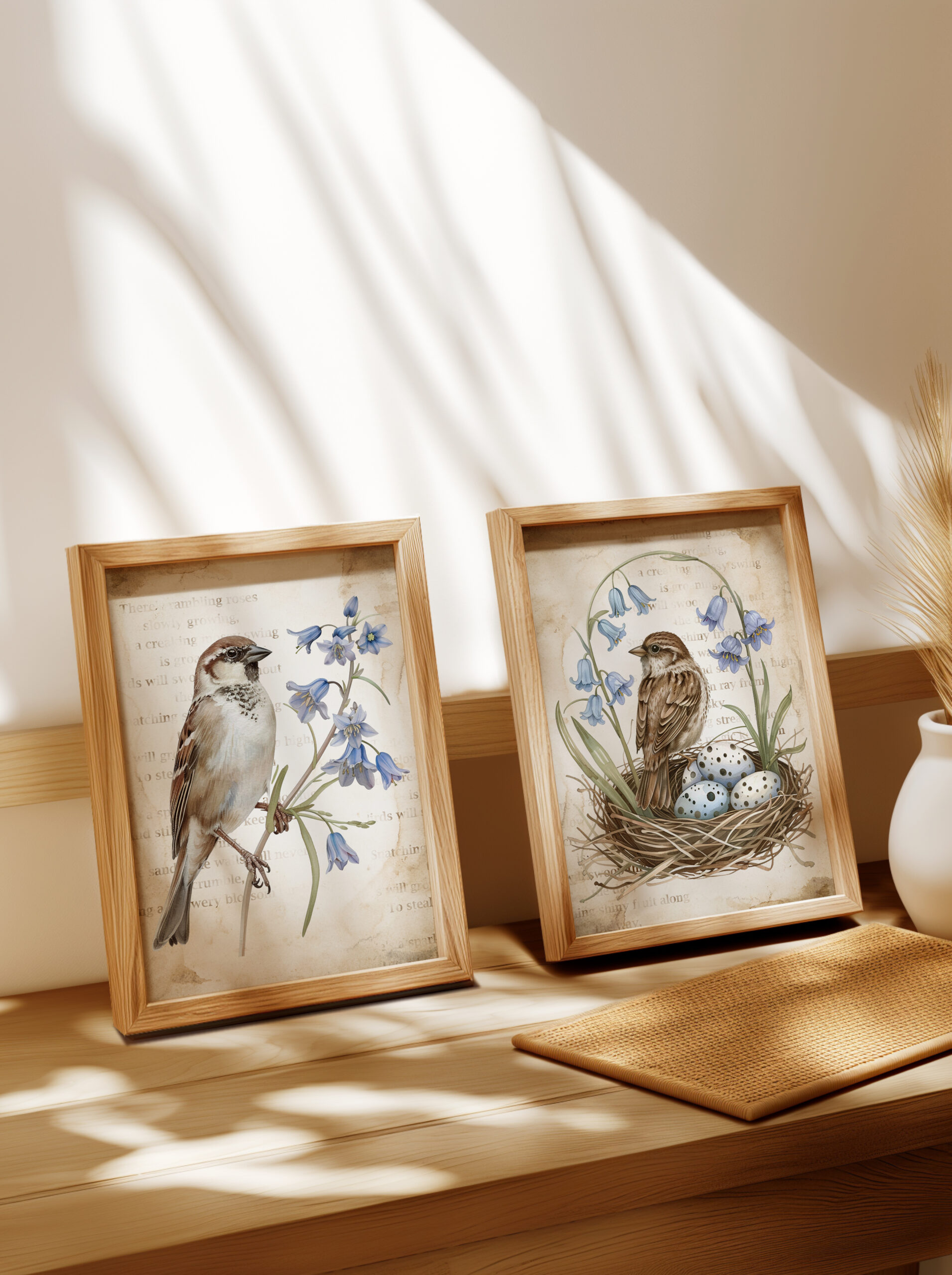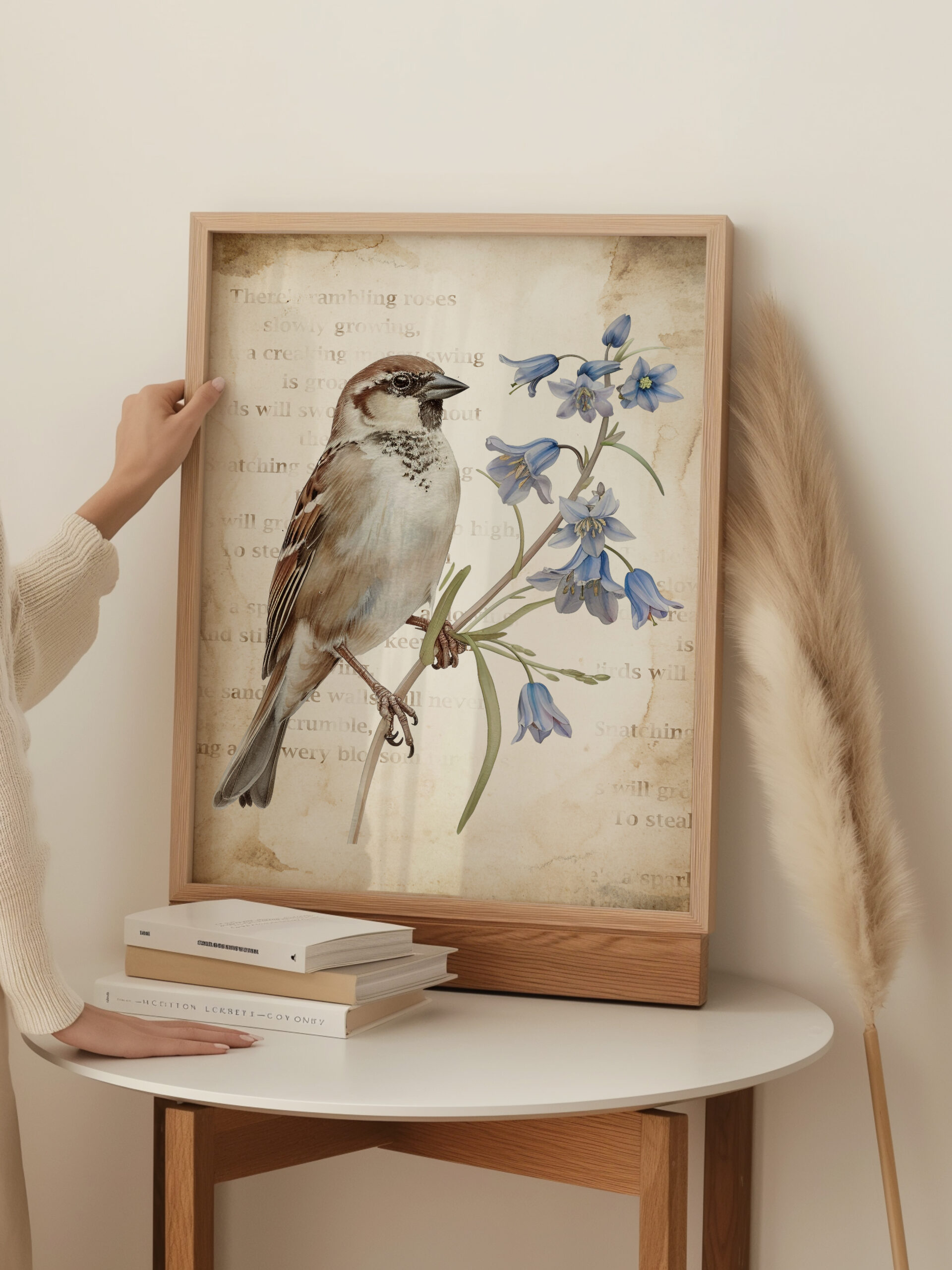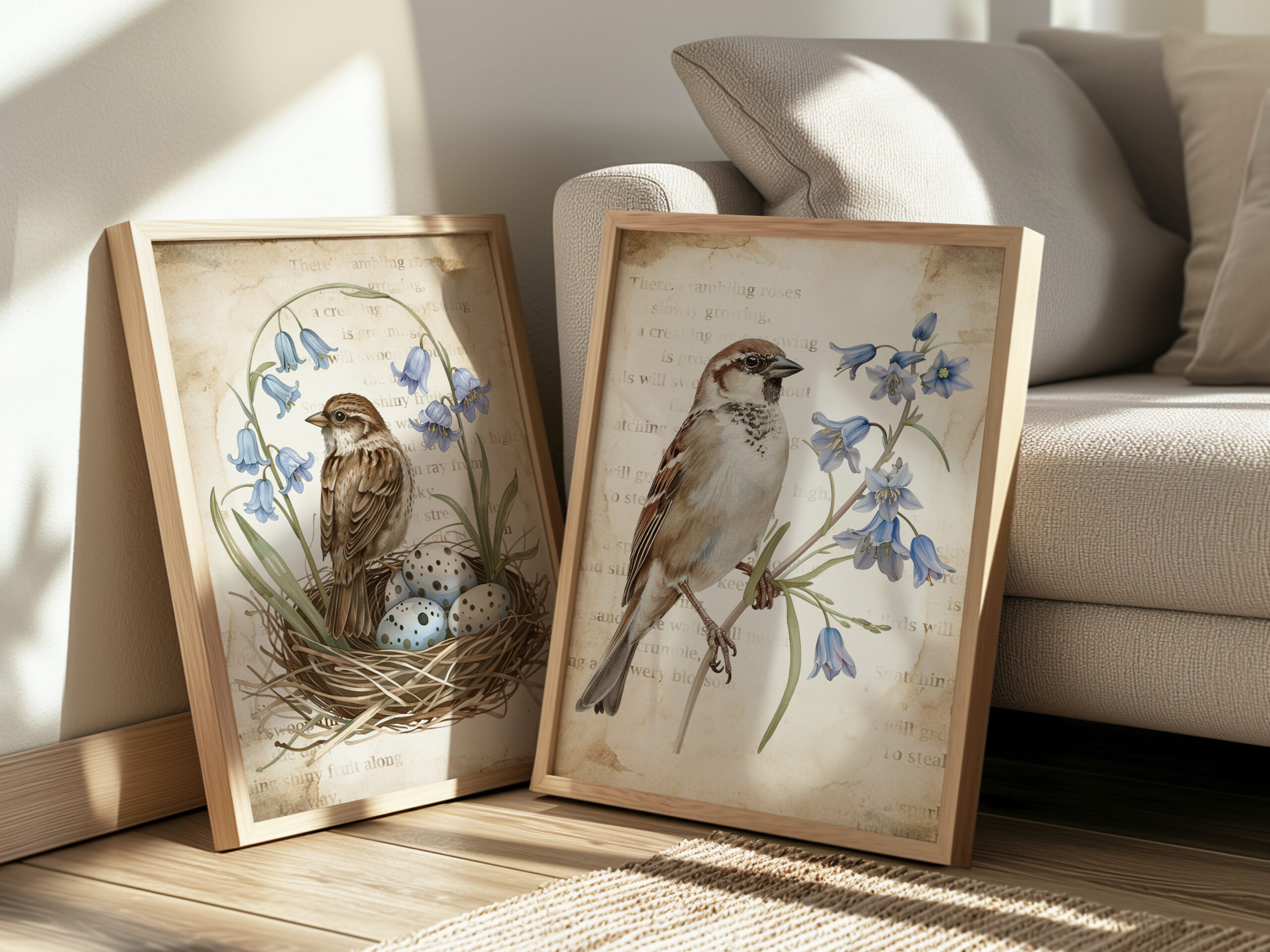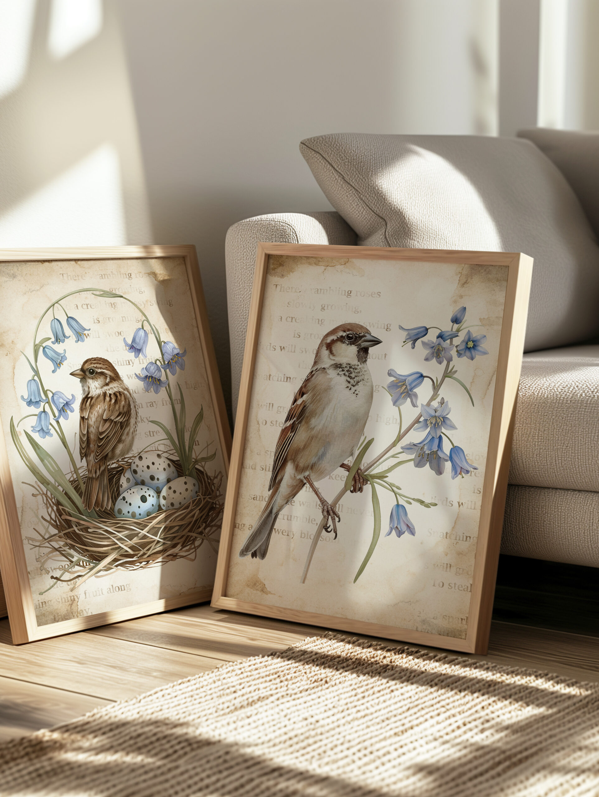 Kiedy się obudziłam, niebo było czyste, a gwiazdy migotały wokół złotego księżyca. Otworzyłam delikatnie okno w sypialni i po cichu słuchałam dźwięków budzącej się natury. Jeszcze było wcześnie, ale gdzieś niedaleko śpiewały już pierwsze ptaki. Ich dźwięk odbił się echem pomiędzy kamienicami. Wziąłam głęboki oddech i zamknęłam oczy. W powietrzu unosił się zapach poranka i wilgotnej ziemi. Chłodny wiatr musnął moje włosy i oplótł ramiona, sprawiając, że zadrżałam jak młode drzewo podczas silnej burzy. Szybko zamknęłam okno, wciągnęłam na siebie obszerny sweter w szarym kolorze i udałam się do salonu. Koty spały na kanapie zwinięte w słodkie rogaliki. W całkowitej ciszy, jedynie z łagodną melodią pochrapywania kotek przystąpiłam do pracy. Zaprojektowałam dwa wiosenne plakaty w stylu vintage z motywem wróbli domowych w otoczeniu niebieskich dzwonków. W tle umieściłam stary, pożółkły i poplamiony kawą papier. Oprócz tego w programie graficznym zrobiłam delikatne napisy w kolorze ciepłego brązu, nadając grafikom staromodnego charakteru. Plakaty udostępniam swoim czytelnikom za darmo, mam nadzieję, że się podobają.